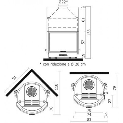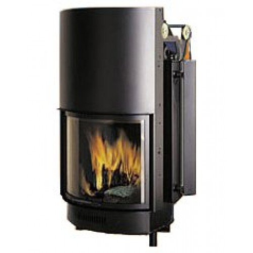 Камин с водяным отоплением из толстой стали, способный производить горячую воду, поступающую в контур системы отопления и на радиаторы, а также производить горячую техническую воду. Дверца сферической формы с подъемом вверх. Камин может устанавливаться как пристенный или как фронтальный.