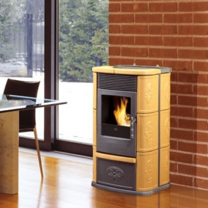 Отопительная печь с облицовкой из цветной керамики с цветочным барельефом. Печь работает на дровах. Принудительная вентиляция. Стальная структура с чугунным очагом.