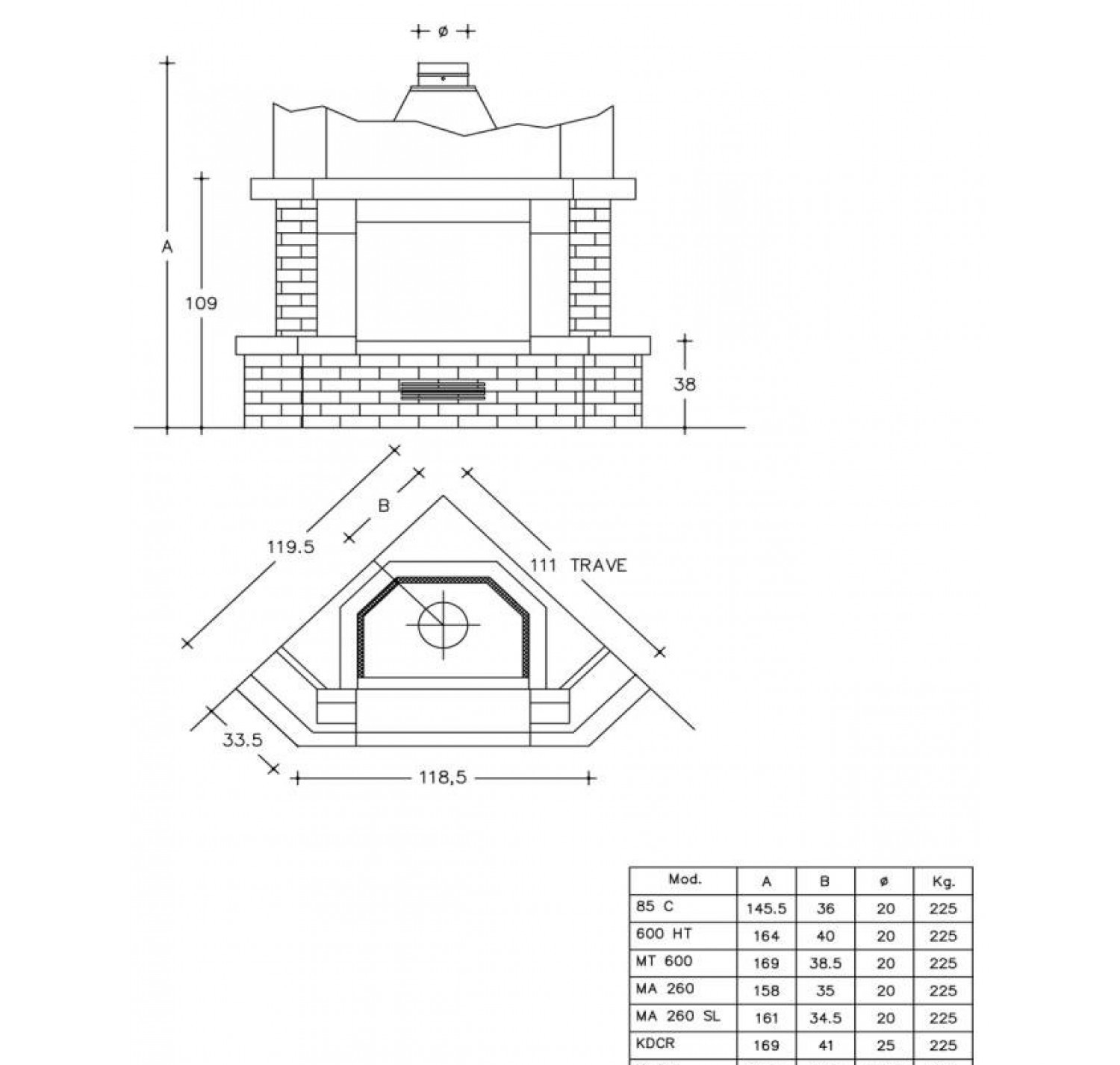 Облицовка из глиняного (необожженного) кирпича. Фронтальная часть, основание и вставки из полированного камня Giallo dIstria. Балка из древесины ели.